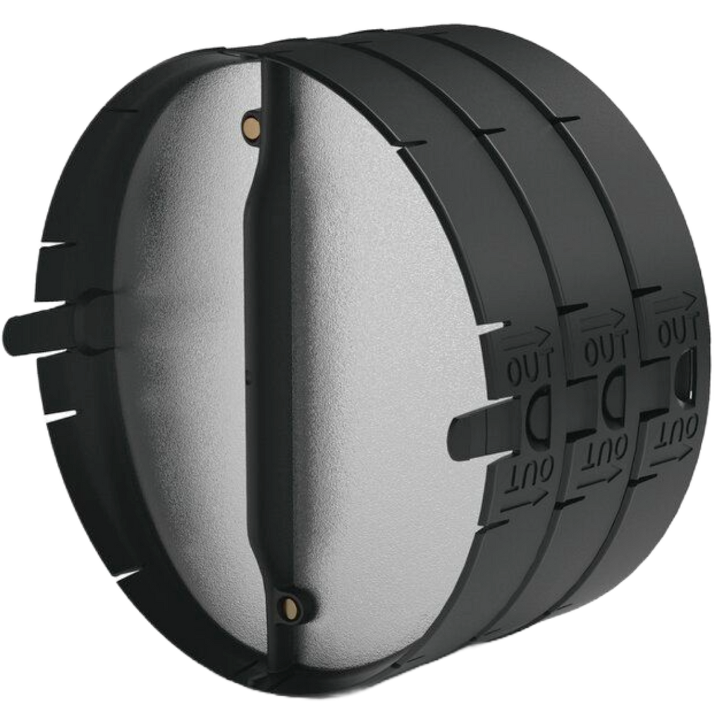 En intelligent varmeisoleret tilbagestrømningsklap, der nemt kan eftermonteres Systemet kan også installeres vertikalt, hvis udsugningssystemet fører til det fri via taget.